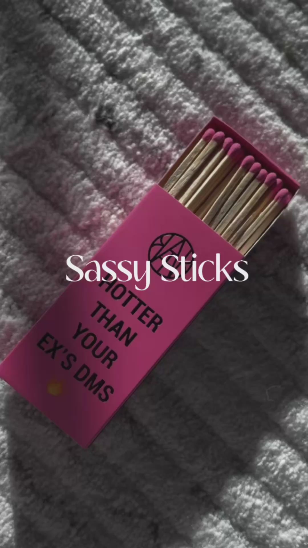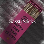 Ed. № 1 features hot fuschia pink box, tray, and match heads, with sayings, "Hotter than your ex's DMs" and "For candles, not bridges (but we won't judge)". An extra large matchbox with sassy vibes in sleek hot pink, with custom matching long-stemmed pink-tipped matchsticks in a sleek elongated box with your favorite brand's sassy sayings. Pairs well with Love Spell Candle.