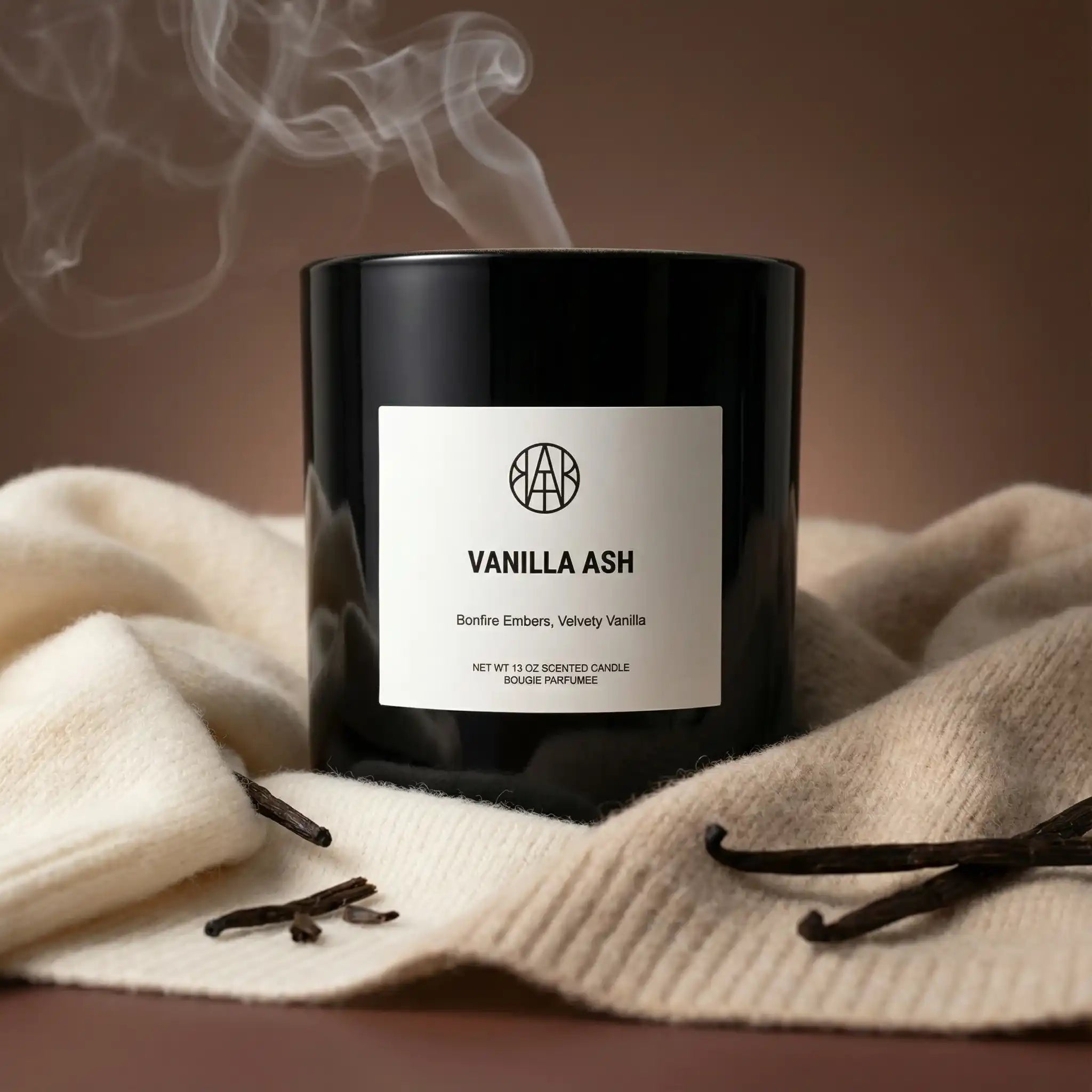AEMBR Vanilluxe scented candle with vanilla beans and dried tobacco leaves.
