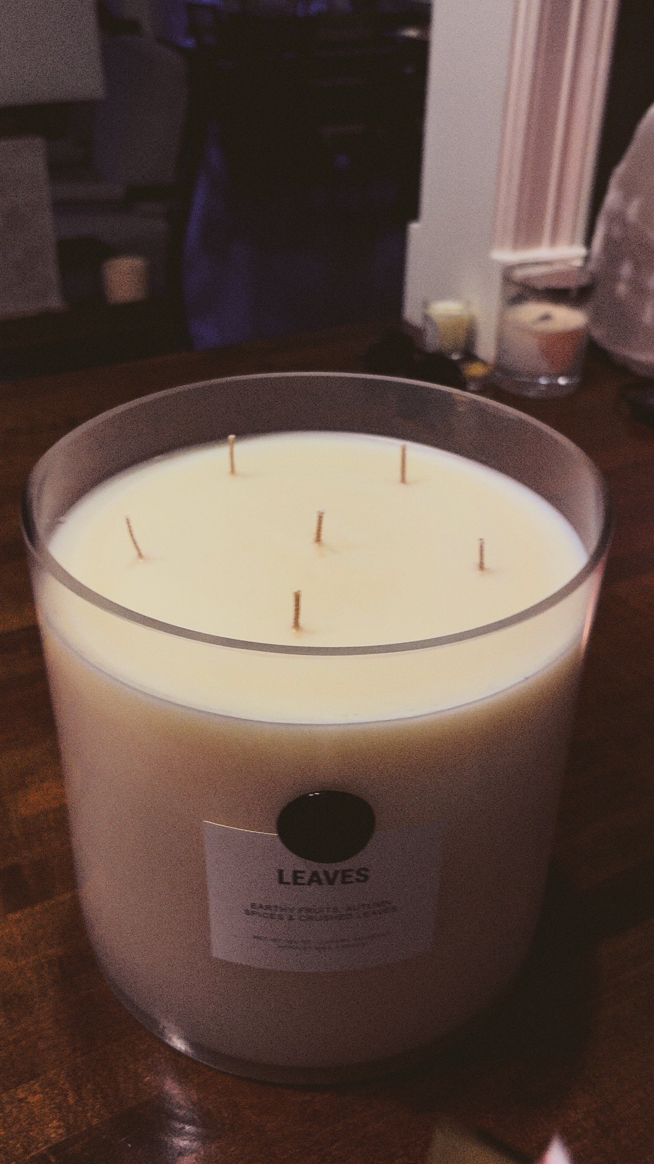 Shop VanilluxeWrap yourself in autumn nostalgia with Leaves. The warm embrace of spiced red apple, cinnamon, and clove sparks memories of laughter by the fire and crisp, golden afternoons. Mulled pear and a bright twist of lemon feel fresh like an October breeze, while hints of pine and golden amber carry you back to long walks beneath rust-colored leaves. In its luminous clear glass jar standing 8 inches tall and 8 inches in diameter and with 6 sparkling cotton wicks, this candle captures everything you cherish about fall, bringing those moments vividly home again.