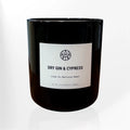 Black glass non-toxic scented candle labeled Tuxedo with Palo Santo, saffron, sandalwood.